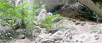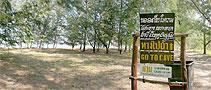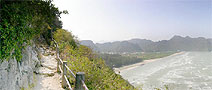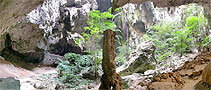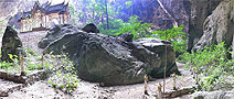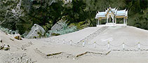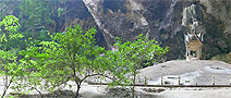 This vast cavern high on a hill with a royal history is a favorite destination for visitors to the park. This cave actually had two large sinkholes, the roofs of which have collapsed allowing sunlight and rain to reach the floor, where trees have rooted reaching for the ceiling. The cave was named for Phraya Nakhon a former ruler who discovered it over 200 years ago after being forced ashore by a violent storm. The central focus within the cave is a four-gabled roofed pavilion bathed by natural sunlight, which was built for the visit of King Rama V on June 20th 1890. This royal pavilion has become the symbol of the province of Prachuap Khiri Khan. King Rama VII visited the cave in June 1926, and one can view the autographs left by both kings on the walls. Phraya Nakhon Cave can be reached from Laem Sala Beach, by a steep rocky trail, 430 m. long and rising to a height of 130 m. | |